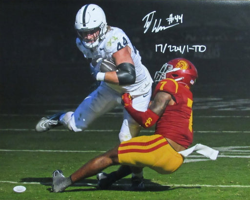 Offered is a Tyler Warren Signed/Inscribed "17/224/1-TD" 16x20 Photo Penn State VS. USC. This photo is authenticated by JSA and includes their tra...