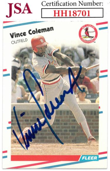 This is a Vince Coleman signed 1988 Fleer Baseball On Card Auto #27 (St. Louis Cardinals). JSA Authentication #HH18701 and JSA Certificate of Authe...