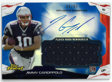 Jimmy Garoppolo signed 2014 Topps Finest Certified Auto/Player Worn Rookie Card (RC) #AJR-JG- 08/99 (New England Patriots)