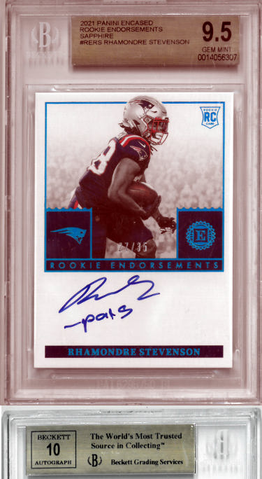 Rhamondre Stevenson 2021 Panini Encased Rookie Endorsements Sapphire Card (RC) #RE-RS- 27/35- BGS Graded 9.5 Gem Mint/10 Auto
