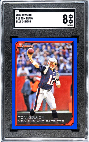 This is a Tom Brady 2006 Bowman Blue Card #11- 145/500- SGC Graded 8 NM-MT (New England Patriots). Image of actual item instock - as shown.