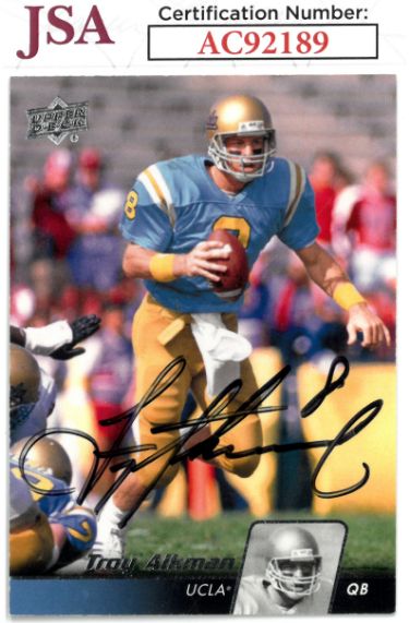 This is a Troy Aikman signed 2011 Upper Deck NCAA Football Card #5- JSA #AC92189 (On Card Auto/UCLA Bruins) Image of actual item instock - as shown.