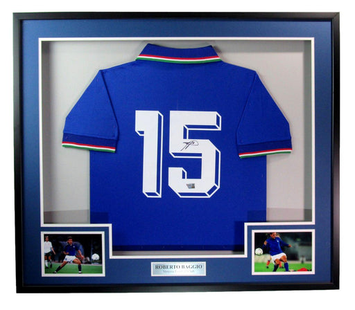 Available for purchase is a framed and autographed Roberto Baggio jersey. This jersey comes with a certification from Fanatics, featuring a tamper-...