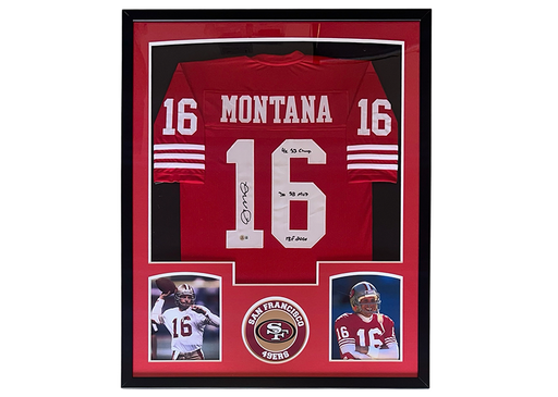 Own an iconic piece of NFL history with this beautifully framed Joe Montana autographed red jersey, professionally presented in a 34x42 display fra...