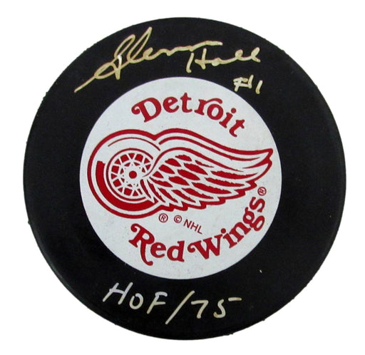 Offered is a Glenn Hall HOF Signed/Inscribed "HOF/75" Detroit Red Wings Hockey Puck. This puck is authenticated by JSA ad includes their Tamper-pro...