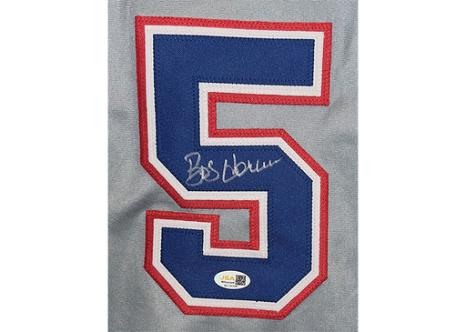 This is a custom baseball jersey in XL hand-signed by Bob Horner. The autograph is certified authentic by JSA. Please note: The photo shown is a st...