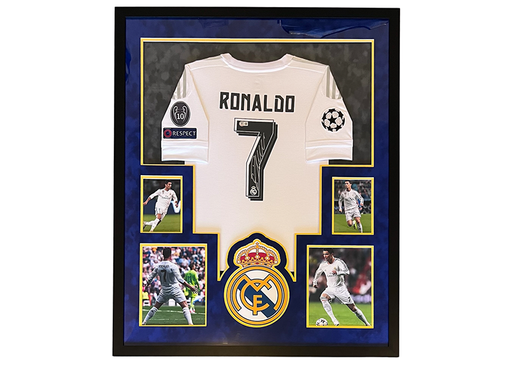 Cristiano Ronaldo autographed Real Madrid jersey professionally framed in a custom 34x42 display. Beckett authenticated with tamper-proof scannable...