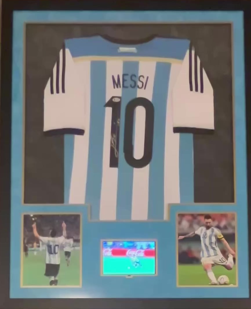 Lionel Messi Autographed Argentina National Team Jersey – Framed with Built-In Video Display & LED Lighting (Beckett Authenticated) | 34x42