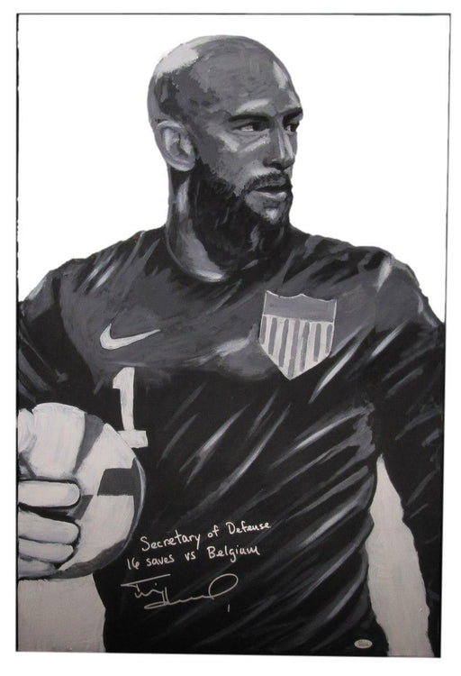 Offered is a Tim Howard Autographed/Inscribed "Secretary of Defense 16 saves vs Belgium" 24x36 B/W Canvas Original Painting U.S. Men's Soccer Team....