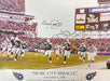 Steve Christie from the Buffalo Bills kicked off, and Tennessee Titans player Lorenzo Neal received. Neal handed the ball off to Titans tight end Frank Wycheck, who threw a lateral across the field to another Titans player, Kevin Dyson, who then ran down the sidelines for a 75-yard touchdown. The play was named "Home Run Throwback" by the Titans and was developed by Special Teams Coordinator Alan Lowry. The Titans ran the play regularly in practices during the regular season, though the practices usually involved Derrick Mason, who had been injured earlier in the game and was unavailable for the situation. Dyson, as one of the team's lead wide receivers, rarely practiced with the special teams unit and was largely unfamiliar with the layout of the play. Nevertheless, his execution of Lowry's vision was flawless and thus became the "Music City Miracle". This Music City Miracle Rare 20X24 Photo is hand signed by Kevin Dyson and the late Frank Wycheck. Full black signatures, Dyson inscribed #87, Wycheck inscribed # 89. Athlon obtained via the Personal Collection from the Late Legendary Bob Hyde “Mr. Oilerâ€, Estate. Beckett Authentication Signature Review Order ID : 65910, Order Item ID #79432.
