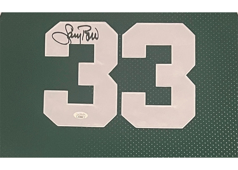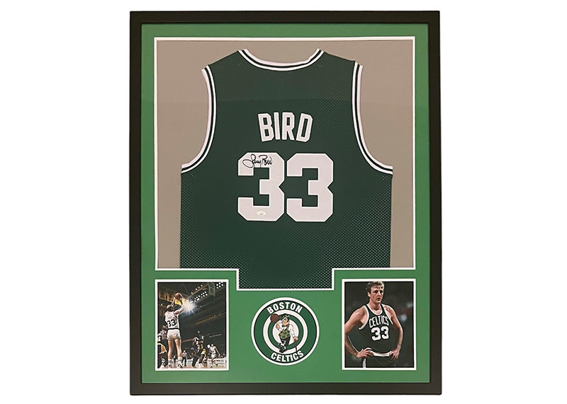 Celebrate the legacy of basketball icon Larry Bird with this Boston Celtics framed jersey. Measuring an impressive 35”x42”, this piece is a must-have for any avid sports collector. The jersey, signed by Larry Bird himself, is authenticated by James Spence Authentication (JSA), ensuring its legitimacy and value as an original collectible. Showcasing the unmistakable green of the Celtics, this jersey is a tangible piece of basketball history. It's not just a garment, but a tribute to the timeless greatness of one of the sport's most revered players. Display it proudly or gift it to a fellow fan; it's a standout addition to any collection.