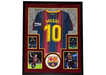Celebrate the greatness of one of the most legendary footballers in history with this stunningly framed 34x42 display featuring an officially signed Lionel Messi FC Barcelona jersey. The iconic No. 10 jersey has been beautifully showcased with professional matting and four action photos of Messi throughout his illustrious Barcelona career, along with the classic FC Barcelona crest.