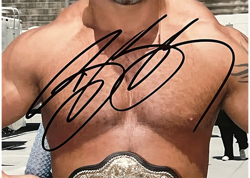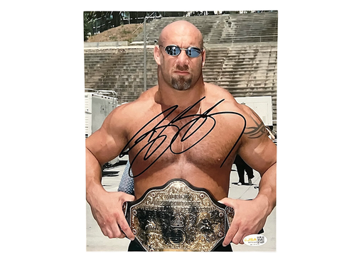 This is an authentic Bill Goldberg autographed 8x10 photo, featuring Goldberg with the WWE Championship Title in a powerful, iconic pose. The autog...