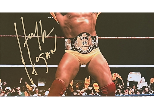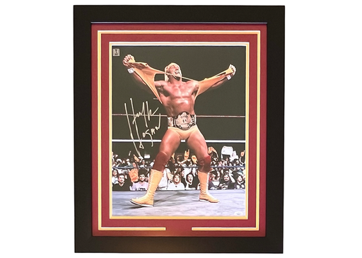 This is a Hulk Hogan signed photo featuring him celebrating with the WWF Championship belt in the ring. The piece is professionally framed and meas...