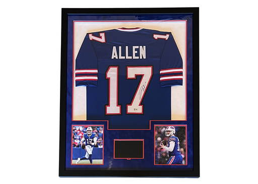 Josh Allen autographed football jersey professionally framed in a custom 34x42 display. Features built-in LED lighting and a playable video TV scre...
