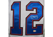 This is a custom football jersey in XL hand-signed by Jim Kelly. The autograph is certified authentic by Beckett.