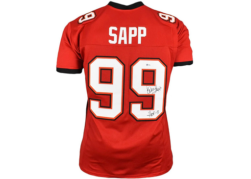 The product is a custom red football jersey signed by Warren Sapp, who is a member of the Pro Football Hall of Fame. The jersey features a "HOF 13"...