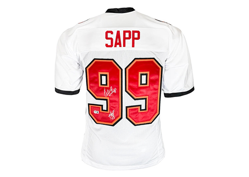 The product is a custom white football jersey signed by Hall of Famer Warren Sapp, with a specific inscription of "HOF 13." The autograph has been ...