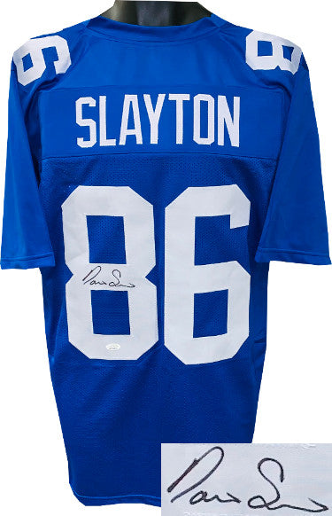 This is a new, in stock, Darius Slayton signed Blue unlicensed Custom Stitched Pro Style Football Jersey with fully stitched twill numbers on the front and back and players name plate, there are NO LOGOS, TAGS, BRAND NAMES or PATCHES ON THIS JERSEY & IS NOT AN OFFICIAL LICENSED JERSEY, 100% polyester, made in the Philippines. Size XL (48/50). JSA Witnessed Authentication Sticker with JSA Certificate of Authenticity.